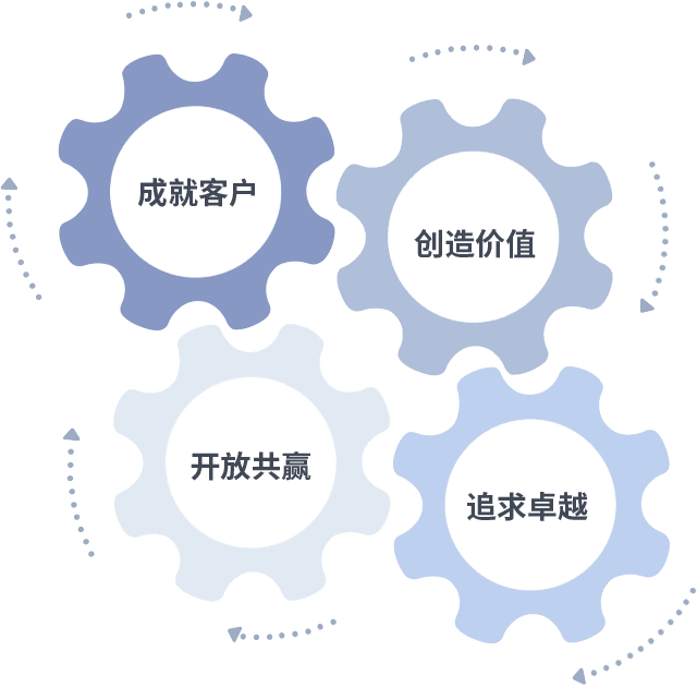 成就客户是一切决策的出发点,,,,创造价值是衡量所有工作的标准,,,追求卓越是我们做事做人的态度,,开放共赢是我们的格局也是最终的结果。。价值观的齿轮环环相扣,,推动着组织里的每个人不断向前。。。。