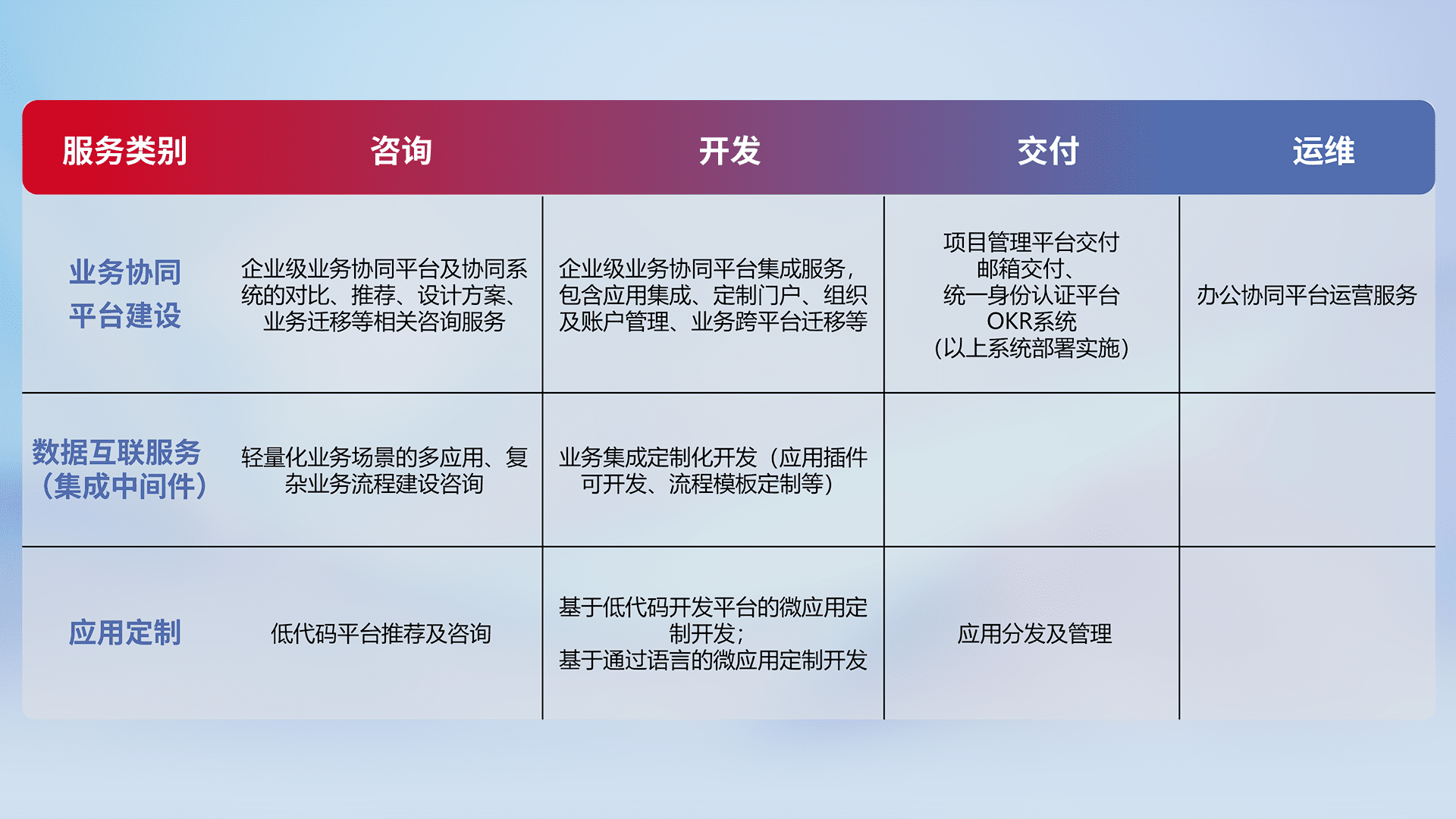 针对钉钉、、企微、、、IDaas等平台级产品提供产品的规划、、方案、、交付、、定制化开发等服务,,实现如统一协同办公、、智能客户服务、、、混合会议管理、、、、智能数据查询、、、、等业务场景,,,实现数字化转型。。。