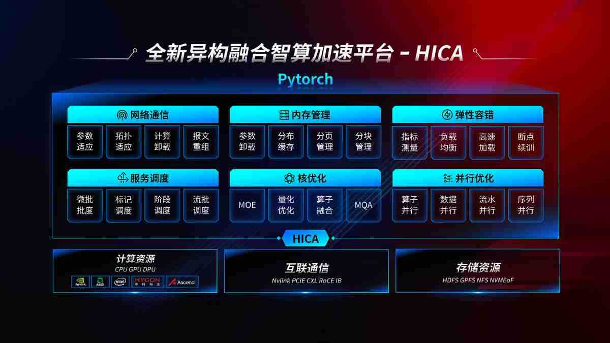通过自研的服务层、、、、中间适配层、、、、以及调度编排算法,,,,采用数据并行、、、模型并行等多种并行方式,,,把并行计算任务进行有效的分解,,,使其分别由相应的软件栈和算力资源来承接。。。当GPU资源变化,,HICA可以实时动态调度计算子任务并调整模型拓扑和架构,,,,以充分聚合各种算力资源。。。。