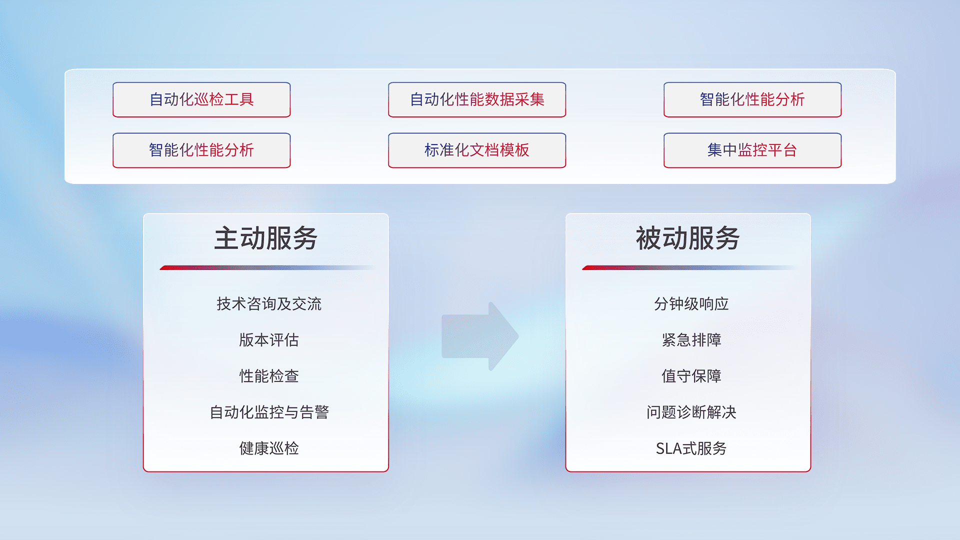 智能化工具和标准化文档,,,保障服务质量,,提供主动服务(包含技术咨询、、版本评估、、、、性能检查、、自动化监控与告警、、、、健康巡检)和被动服务包含(分钟级响应、、、紧急排障、、、、值守保障、、、问题诊断解决、、、、SLA服务)。。。。